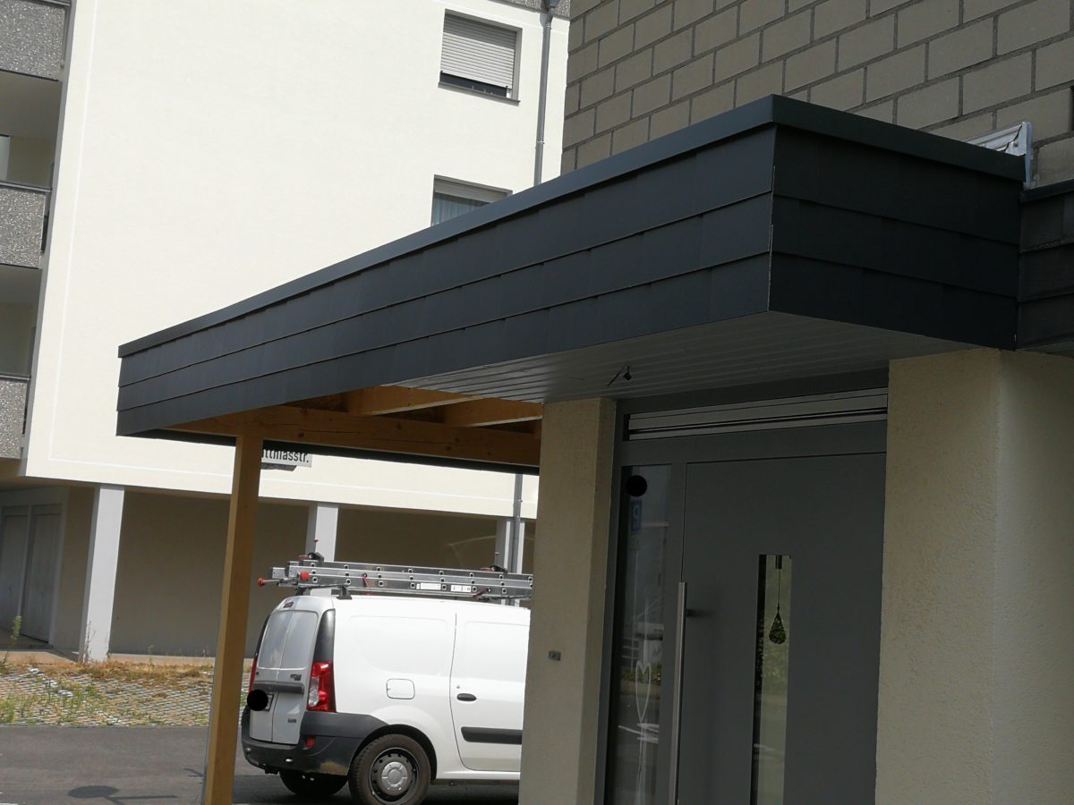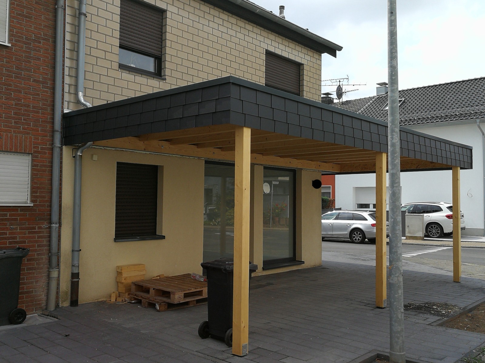 Carport aus KVH Holz, 20×30 cm FZ Platten und einer Abdeckung aus Aluminium in Anthrazit.