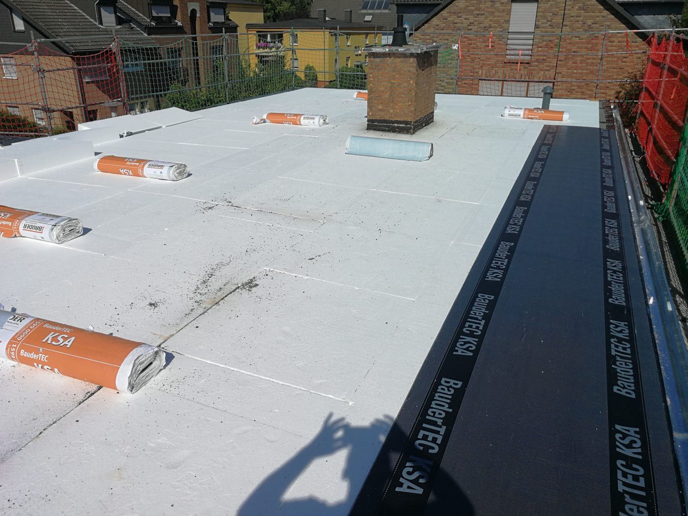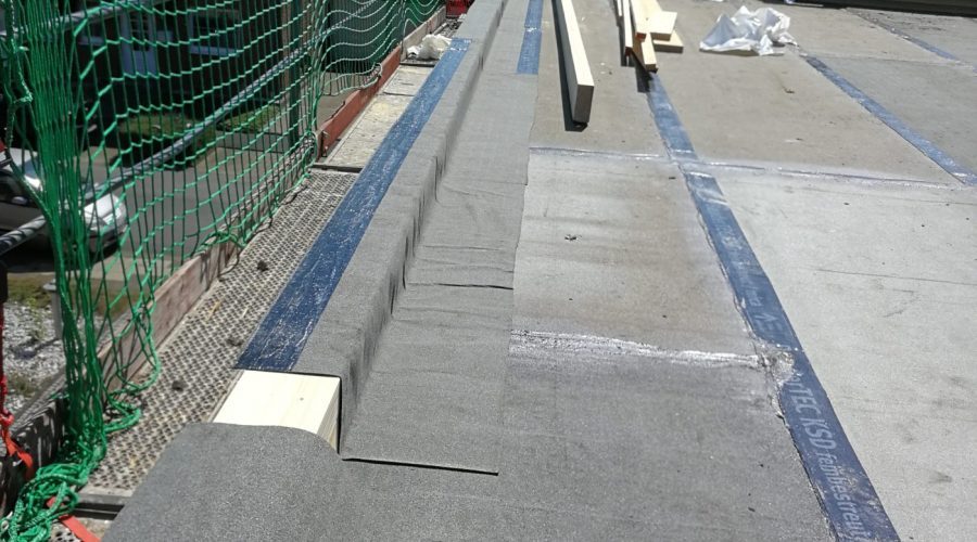 Flachdachsanierung mit einer Gefälledämmung nach EnEV. Und einer Dachrinne und Zinkscharen umlaufend.