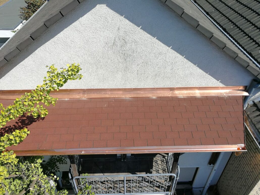 Rechteckschindeln in rot und einer Kupferrinne